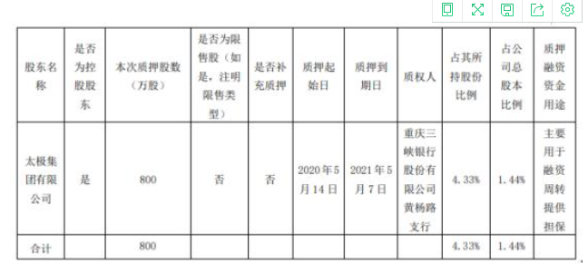 太極集團股東太極有限質(zhì)押800萬股 用于融資周轉(zhuǎn)提供擔(dān)保