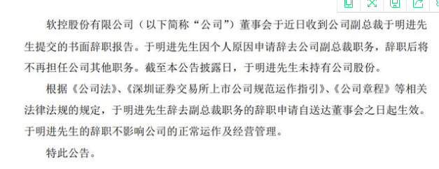 軟控股份表示根據(jù)《公司法》、《深圳證券交易所上市公司規(guī)范運(yùn)作指引》、《公司章程》等相關(guān)法律法規(guī)的規(guī)定,于明進(jìn)辭去副總裁職務(wù)的辭職申請自送達(dá)董事會之日起生效。于明進(jìn)的辭職不影響公司的正常運(yùn)作及經(jīng)營管理。