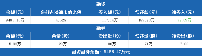 融資方面,當日融資買入117.14萬元,融資償還189.23萬元,融資凈償還72.09萬元,連續(xù)7日凈償還累計792.92萬元。融券方面,融券賣出1萬股,融券償還1.71萬股,融券余量1.29萬股,融券余額5.33萬元。融資融券余額合計9488.47萬元。