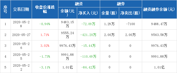 摘要: 融資方面,當日融資買入117.14萬元,融資償還189.23萬元,融資凈償還72.09萬元,連續(xù)7日凈償還累計792.92萬元。融券方面,融券賣出1萬股,融券償還1.71萬股,融券余量1.29萬股,融券余額5.33萬元。融資融券余額合計9488.47萬元。
