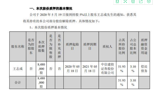 5月20日消息,清源股份(603628)發(fā)布公告,公司股東王志成向中信建投證券股份有限公司質押848萬股,用于償還債務。