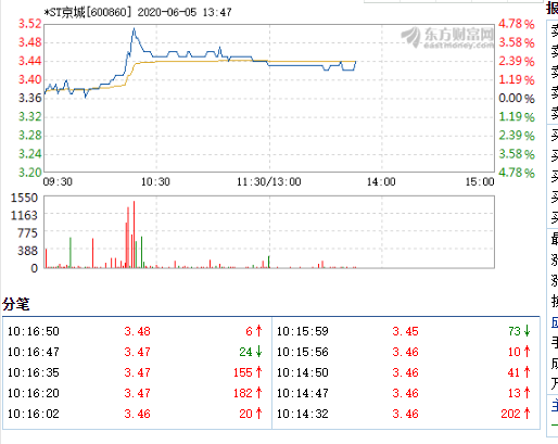 6月5日,*ST京城盤中快速上漲,5分鐘內漲幅超過2%,截至10點16分,報3.48元,成交231.25萬元,換手率0.21%。