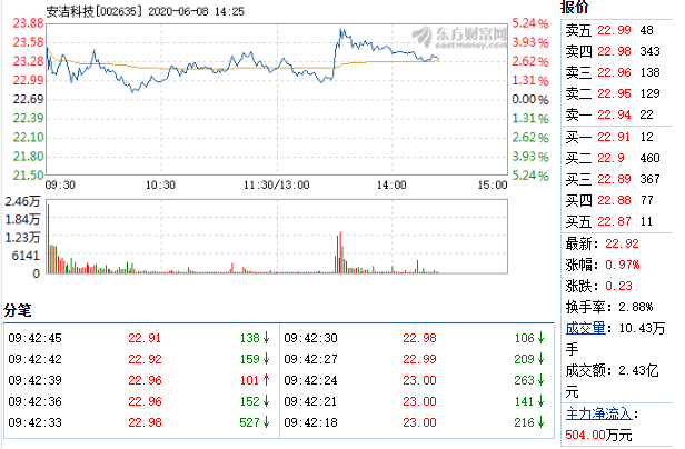 6月8日,安潔科技盤中快速回調(diào),5分鐘內(nèi)跌幅超過2%,截至9點42分,報22.92元,成交2.43億元,換手率2.88%。