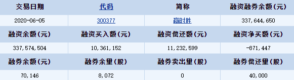 贏時勝(300377)2020-06-05融資融券信息顯示,贏時勝融資余額337,574,504元,融券余額70,146元,融資買入額10,361,152元,融資償還額11,232,599元,融資凈買額-871,447元,融券余量8,072股,融券賣出量0股,融券償還量40,000股,融資融券余額337,644,650元。贏時勝融資融券詳細信息如下表: