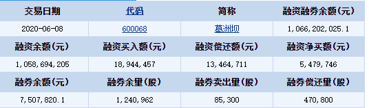 葛洲壩(600068)2020-06-08融資融券信息顯示,葛洲壩融資余額1,058,694,205元,融券余額7,507,820.1元,融資買入額18,944,457元,融資償還額13,464,711元,融資凈買額5,479,746元,融券余量1,240,962股,融券賣出量85,300股,融券償還量470,800股,融資融券余額1,066,202,025.1元。葛洲壩融資融券詳細(xì)信息如下表: