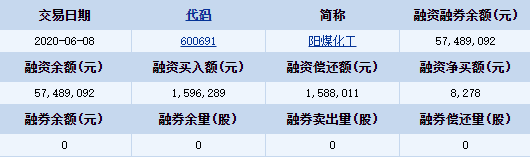 摘要: 陽煤化工融資余額57,489,092元,融券余額0元,融資買入額1,596,289元,融資償還額1,588,011元,融資凈買額8,278元,融券余量0股