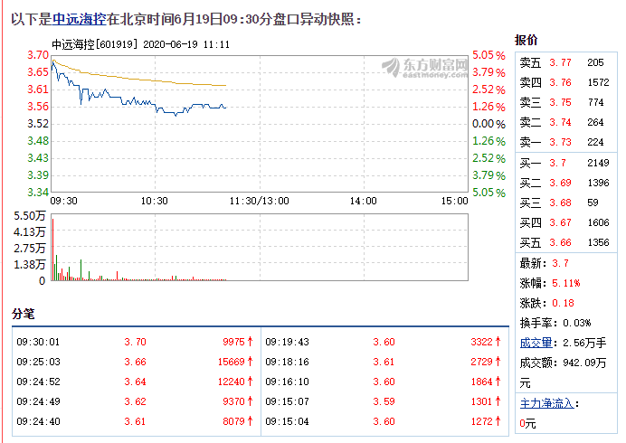 6月19日,中遠??亻_盤漲幅達5%,截至9點30分,報3.7元,成交942.09萬元,換手率0.03%。