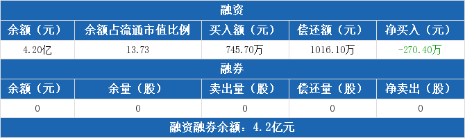 融資方面,當日融資買入745.7萬元,融資償還1016.1萬元,融資凈償還270.4萬元。融券方面,融券賣出0股,融券償還0股,融券余量0股,融券余額0元。融資融券余額合計4.2億元。