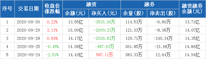 融資方面,當(dāng)日融資買入3338.24萬元,融資償還6871.5萬元,融資凈償還3533.26萬元,連續(xù)4日凈償還累計(jì)8746.93萬元。融券方面,融券賣出8.37萬股,融券償還15.17萬股,融券余量114.53萬股,融券余額1556.49萬元。融資融券余額合計(jì)13.71億元。