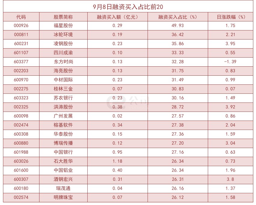 個(gè)股方面,滬深兩市共有1620只個(gè)股有融資資金買入。從融資買入額占當(dāng)日總成交金額比重來(lái)看,共有106只股票融資買入額占比超20%,其中福星股份(49.93%)、冰輪環(huán)境(36.42%)、凌鋼股份(35.86%)排名前三。