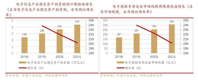 電子整體裝聯(lián)設(shè)備是這些下游制造行業(yè)的必須設(shè)備和基礎(chǔ)設(shè)施,下游企業(yè)的新建生產(chǎn)線、更新生產(chǎn)線都會帶來巨大需求。我國已經(jīng)成為世界電子產(chǎn)品制造中心,電子信息產(chǎn)業(yè)固定投資保持高速增長,據(jù)中國產(chǎn)業(yè)信息網(wǎng)預(yù)計,2019~2021年,電子信息產(chǎn)業(yè)固定資產(chǎn)投資額分別為2.96萬億、3.61萬億、4.34萬億元,增長率分別為24%、22%、20%。