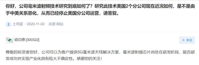 11月24日,【碩貝德(300322)、股吧】在投資者互動(dòng)平臺(tái)表示,公司可以為客戶(hù)提供5G毫米波天線解決方案,毫米波射頻芯片尚處在研發(fā)階段,能否研發(fā)成功并實(shí)現(xiàn)產(chǎn)業(yè)化具有較大不確定性。