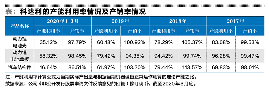 2017年以來,科達利的各產品產能利用率大幅下降。動力鋰電池殼的產能利用率從2017年83.08%下降至2019年60.18%,動力鋰電池蓋板的產能利用率從96.28%下降至79.42%,汽車結構件的產能利用率從69.83%下降至61.97%。