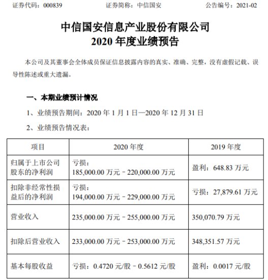 摘要: 1月30日,中信國安(000839)近日發(fā)布2020年業(yè)績預(yù)告,預(yù)計業(yè)績虧損。報告期內(nèi)歸屬于上市公司股東的凈利潤虧損185,000.00萬元–220,000.00萬元,上年同期盈利648.83萬元,同比由盈轉(zhuǎn)虧;基本每股收益虧損0.4720元/股–0.5612元/股。