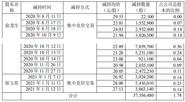 公司股東鄭玉英以集中競價(jià)交易方式減持公司股份1150.34萬股,本次減持價(jià)格區(qū)間為26.92-28元/股,套現(xiàn)約3.22億元。