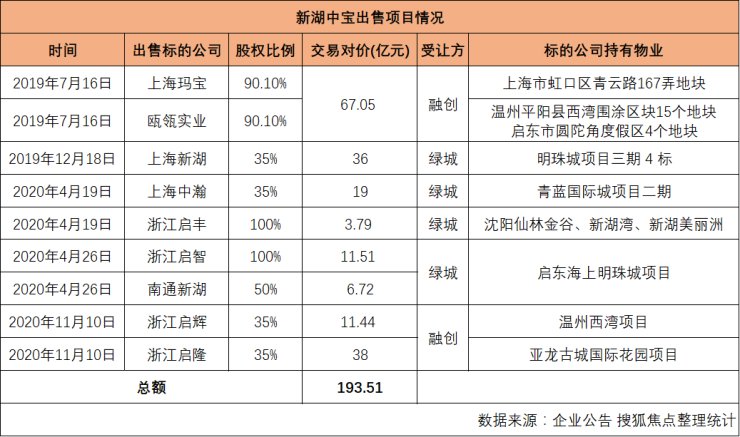 早在2019年7月16日,新湖中寶將其持有的浙江甌瓴實(shí)業(yè)有限公司和上?,攲毞康禺a(chǎn)開發(fā)有限公司的股權(quán)及相應(yīng)權(quán)益轉(zhuǎn)讓給融創(chuàng)中國旗下公司,交易價款為67.05億元,涉及長三角20宗地塊。
