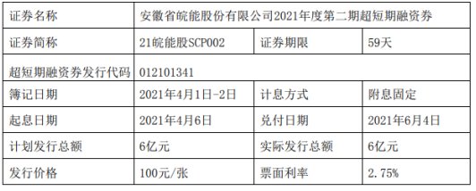 皖能電力發(fā)行6億短期融資券 票面利率2.75%