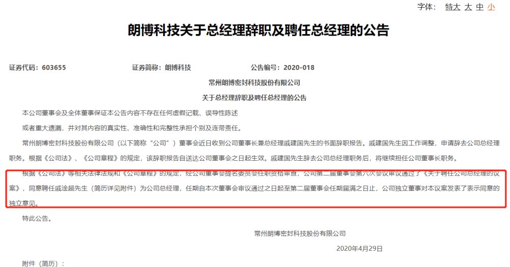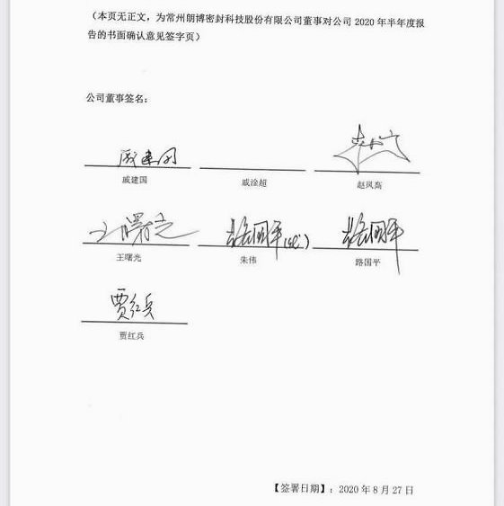 去年8月27日,常州【朗博科技(603655)、股吧】召開(kāi)董事會(huì)審議2020半年報(bào),當(dāng)天總經(jīng)理缺席,也未在報(bào)告上簽字。