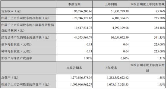 報(bào)告期內(nèi)公司實(shí)現(xiàn)營(yíng)業(yè)收入96,286,200.66元,同比增長(zhǎng)85.76%;原因?yàn)椋荷夏晖谝蛞咔橛绊懟鶖?shù)低;本期下游客戶需求增長(zhǎng),景氣度高,公司在手訂單飽滿。