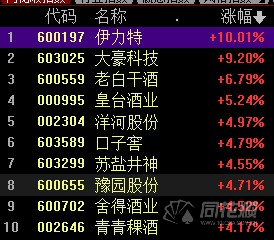 白酒概念指數(shù)高開高走,截至發(fā)稿,指數(shù)漲近3%,伊力特(600197)漲停,大豪科技(603025)封板后回落,老白干酒(600559)、豫園股份(600655)、皇臺酒業(yè)(000995)等跟漲。