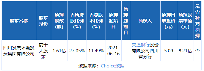 摘要: 清新環(huán)境6月23日發(fā)布公告,前十大股東四川發(fā)展環(huán)境投資集團(tuán)于2021年6月16日將1.61億股進(jìn)行質(zhì)押,質(zhì)押股數(shù)占所持公司股份的27.05%,占公司總股本的11.49%,質(zhì)權(quán)人為交通銀行四川省分行。