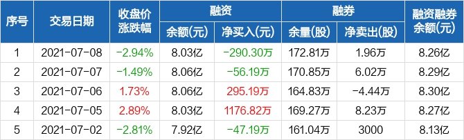 天山股份融資融券信息顯示,2021年7月8日融資凈償還290.3萬元;融資余額8.03億元,較前一日下降0.36%。