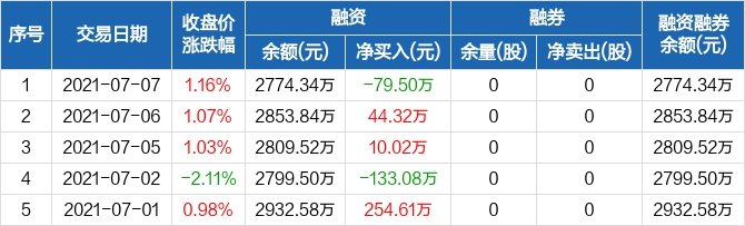 融資方面,當(dāng)日融資買入273.89萬元,融資償還353.39萬元,融資凈償還79.5萬元。融券方面,融券賣出0股,融券償還0股,融券余量0股,融券余額0元。融資融券余額合計(jì)2774.34萬元。