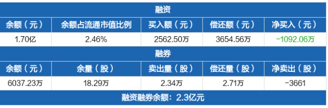 融資方面,當日融資買入2562.5萬元,融資償還3654.56萬元,融資凈償還1092.06萬元。融券方面,融券賣出2.34萬股,融券償還2.71萬股,融券余量18.29萬股,融券余額6037.23萬元。融資融券余額合計2.3億元。