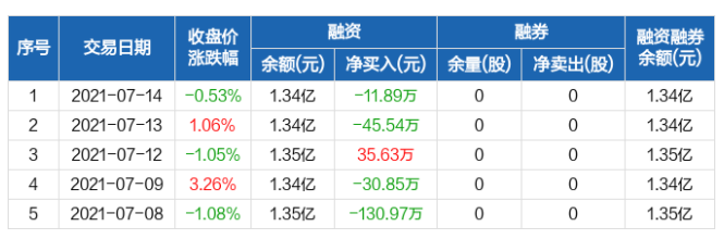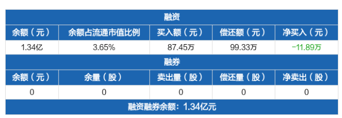 融資方面,當(dāng)日融資買入87.45萬元,融資償還99.33萬元,融資凈償還11.89萬元。融券方面,融券賣出0股,融券償還0股,融券余量0股,融券余額0元。融資融券余額合計1.34億元。