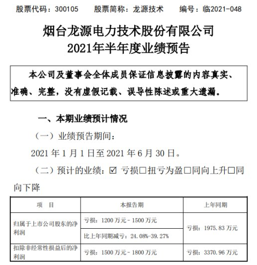 龍源技術(shù)2021年上半年預(yù)計虧損1200萬-1500萬同比虧損減少 各項工作穩(wěn)步推進(jìn)2021年上半年預(yù)計虧損1200萬-1500萬同比虧損減少 各項工作穩(wěn)步推進(jìn)