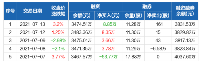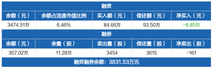融資方面,當日融資買入84.66萬元,融資償還93.5萬元,融資凈償還8.85萬元。融券方面,融券賣出3454股,融券償還3615股,融券余量11.28萬股,融券余額357.02萬元。融資融券余額合計3831.53萬元。