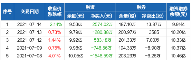 融資方面,當(dāng)日融資買入1088.38萬元,融資償還3662.39萬元,融資凈償還2574.02萬元,連續(xù)5日凈償還累計(jì)6731.22萬元。融券方面,融券賣出7.65萬股,融券償還21.52萬股,融券余量187.1萬股,融券余額3768.16萬元。融資融券余額合計(jì)9.91億元。