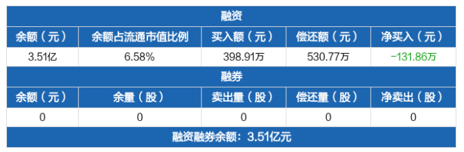融資方面,當(dāng)日融資買入398.91萬元,融資償還530.77萬元,融資凈償還131.86萬元。融券方面,融券賣出0股,融券償還0股,融券余量0股,融券余額0元。融資融券余額合計(jì)3.51億元。