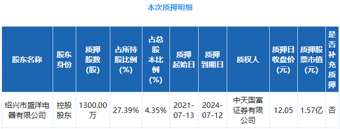盛洋科技7月15日發(fā)布公告,控股股東紹興市盛洋電器于2021年7月13日將1300萬股進(jìn)行質(zhì)押,質(zhì)押股數(shù)占所持公司股份的27.39%,占公司總股本的4.35%,質(zhì)權(quán)人為中天國富證券。按質(zhì)押日收盤價12.05元計算,本次質(zhì)押股票市值約為1.57億元。截至最新公告日,紹興市盛洋電器累計質(zhì)押4180萬股,占其持有公司股份總數(shù)的88.07%,占公司總股本的14.00%。