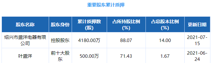 摘要: 盛洋科技控股股東質(zhì)押1300萬股,累計質(zhì)押占持股比88.07%