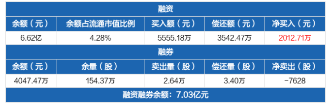 融資方面,當(dāng)日融資買(mǎi)入5555.18萬(wàn)元,融資償還3542.47萬(wàn)元,融資凈買(mǎi)入2012.71萬(wàn)元。融券方面,融券賣(mài)出2.64萬(wàn)股,融券償還3.4萬(wàn)股,融券余量154.37萬(wàn)股,融券余額4047.47萬(wàn)元。融資融券余額合計(jì)7.03億元。