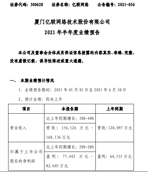 7月14日,億聯(lián)網(wǎng)絡(luò) 近日發(fā)布2021年半年度業(yè)績預(yù)告,預(yù)計(jì)業(yè)績同向上升。報(bào)告期內(nèi)歸屬于上市公司股東的凈利潤77,442萬元-82,605萬元,比上年同期增長20%-28%。