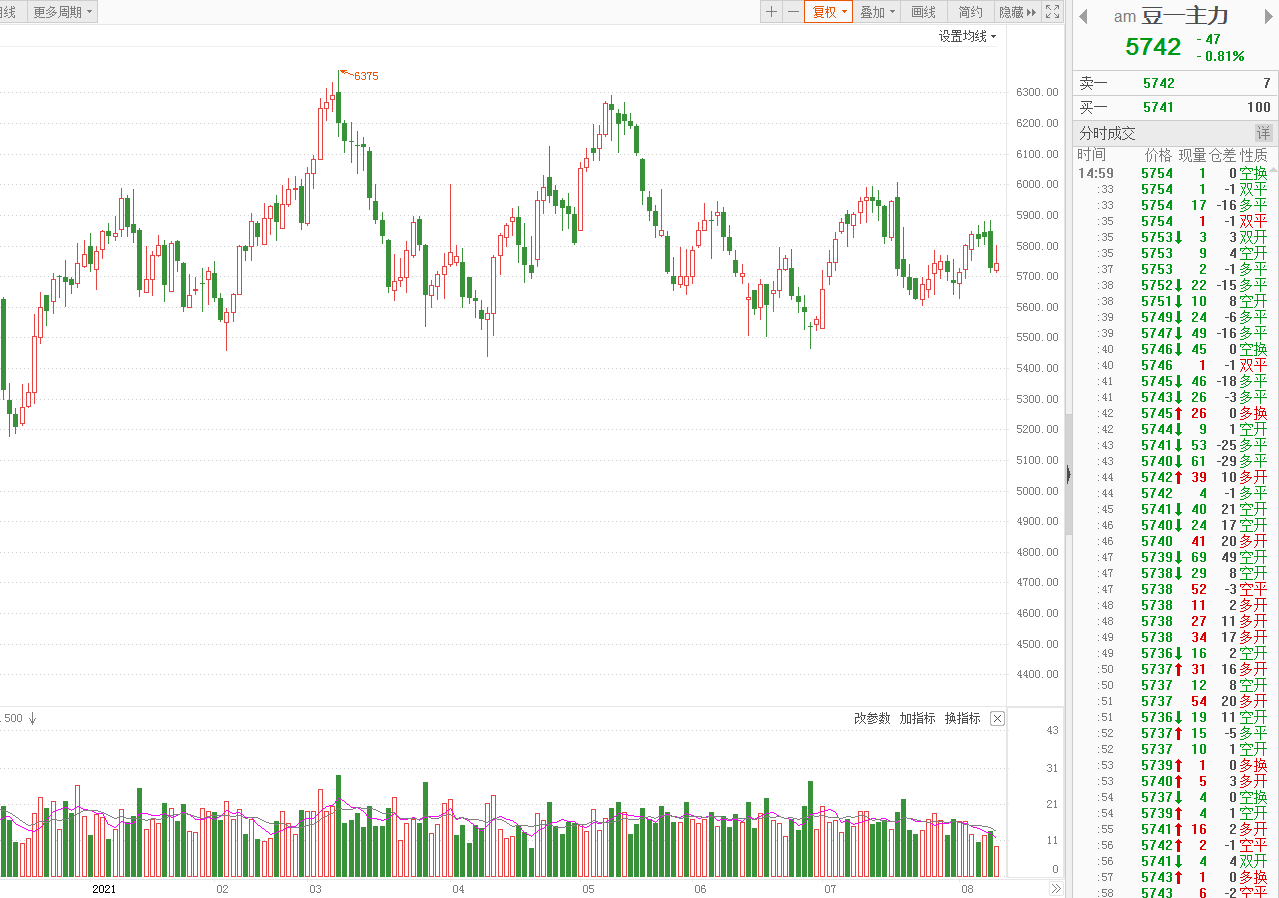 摘要: 近期大豆價格有所回落,8月10日,大連商品交易所大豆主力合約報5742元/噸,較今年3月8日的最高點6375元/噸下降約10%;芝加哥商業(yè)交易所大豆主力合約報1338.75美分/蒲式耳(截止北京時間15:30分),較今年5月份的高點下降約20%。隨著今年新豆供應(yīng)增加,預(yù)計后續(xù)價格還會延續(xù)下降趨勢。