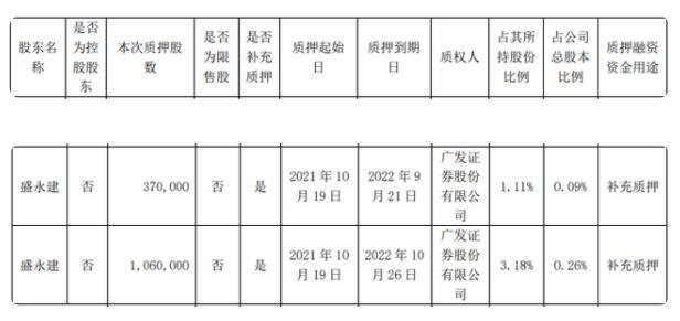 本次質(zhì)押股份143萬(wàn)股,占其所持公司股份的4.29%,占公司總股本比例的0.35%。質(zhì)押期限為2021年10月19日至2022年10月26日。
