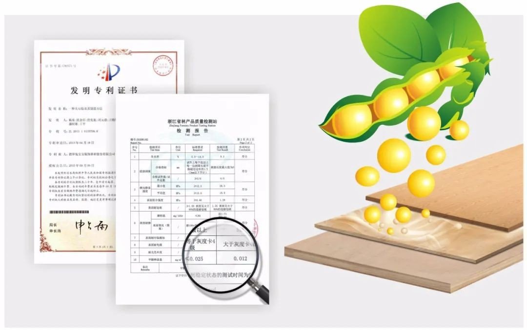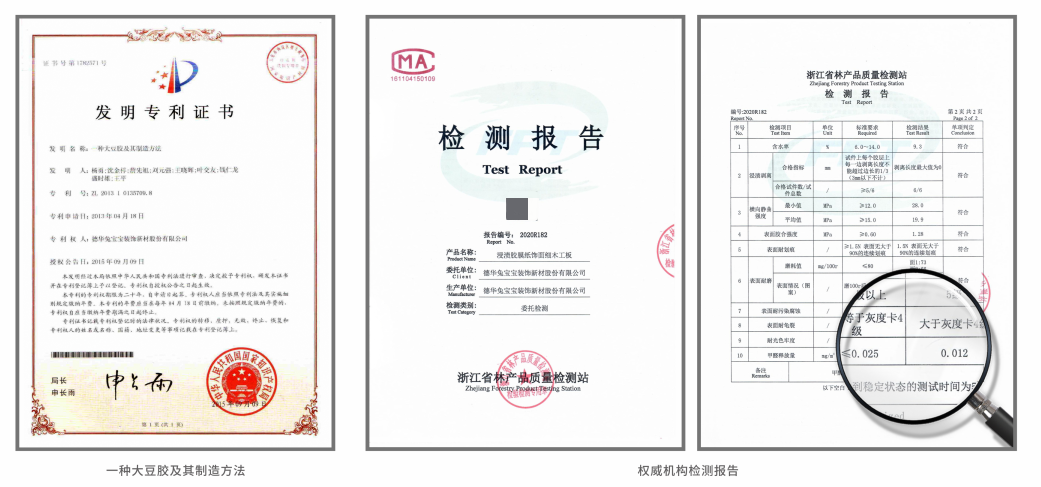 兔寶寶植物膠板材擁有“大豆膠及其制造方法”國(guó)家專(zhuān)利,經(jīng)權(quán)威機(jī)構(gòu)檢測(cè),兔寶寶植物膠板材甲醛釋放含量≤0.02mg/m?,環(huán)保性能毋庸置疑。