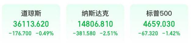 美東時間1月13日16:00(北京時間1月14日05:00),道瓊斯工業(yè)平均指數(shù)小幅下跌176.70點(diǎn),跌幅為0.49%,報36113.62點(diǎn)。納斯達(dá)克綜合指數(shù)大跌381.58點(diǎn),跌幅為2.51%,報14806.81點(diǎn)。標(biāo)準(zhǔn)普爾500指數(shù)下跌67.32點(diǎn),跌幅為1.42%,報4659.03點(diǎn)。