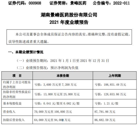 摘要: 1月30日,景峰醫(yī)藥(000908)近日發(fā)布2021年度業(yè)績預(yù)告,報告期內(nèi)歸屬于上市公司股東的凈利潤虧損3,600萬元至7,200萬元,上年同期虧損106,851.49萬元,較上年同期虧損減少;基本每股收益虧損0.041元/股至0.082元/股。