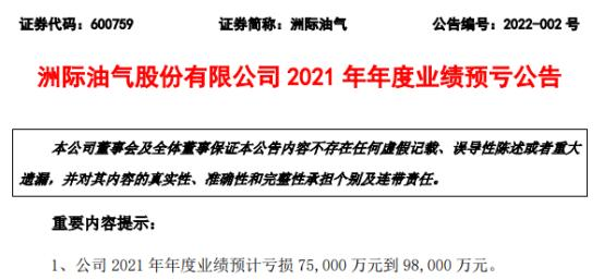 1月29日,【洲際油氣(600759)、股吧】(600759)發(fā)布2021年年度業(yè)績預(yù)告:預(yù)計2021年年度實現(xiàn)歸屬于上市公司股東的凈利潤較上年同期由盈轉(zhuǎn)虧,報告期內(nèi)歸屬于上市公司股東的凈利潤約為-75,000萬元到-98,000萬元。