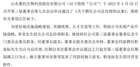 賽托生物(300583)(300583)董事會于2022年5月25日召開第三屆董事會第九次會議審議通過了《關(guān)于聘任公司總經(jīng)理的議案》,現(xiàn)將有關(guān)事項公告如下: