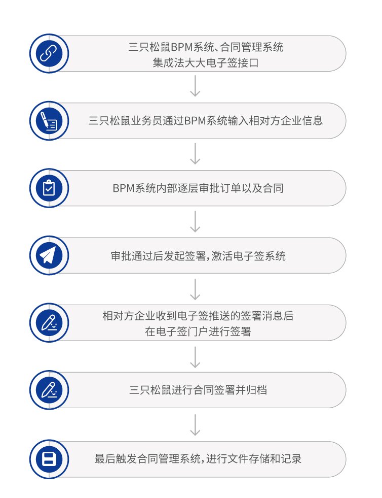目前,通過在自有系統(tǒng)中對接法大大電子簽接口,三只松鼠已于人事、采購、訂貨等場景實現(xiàn)電子合同高效簽約。