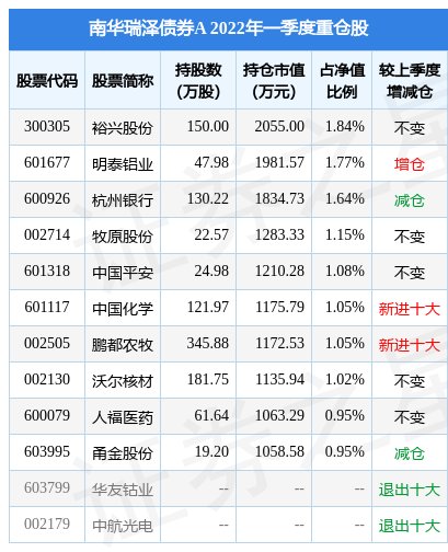 根據(jù)2022Q1季報(bào)基金重倉股數(shù)據(jù),重倉該股的基金共1家,其中持有數(shù)量最多的基金為南華瑞澤債券A。南華瑞澤債券A目前規(guī)模為11.17億元,最新凈值1.0138(5月31日),較上一交易日上漲0.6%,近一年下跌0.78%。該基金現(xiàn)任基金經(jīng)理為何林澤。何林澤在任的公募基金包括:南華瑞泰39個(gè)月定開A,管理時(shí)間為2021年4月28日至今,期間收益率為3.45%;南華瑞盈混合發(fā)起A,管理時(shí)間為2021年8月17日至今,期間收益率為-16.1%;南華瑞利債券A,管理時(shí)間為2021年9月8日至今,期間收益率為2.04%。