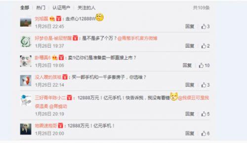 評(píng)論立刻就沸騰了?!百I(mǎi)一部手機(jī)和一千多套房子,你選啥?”“我數(shù)學(xué)不好,不要騙我?!薄案杏X(jué)這價(jià)格只有一哥買(mǎi)得起,1.2888億?!薄澳銈冑u(mài)的手機(jī)還是戰(zhàn)斗機(jī)?”