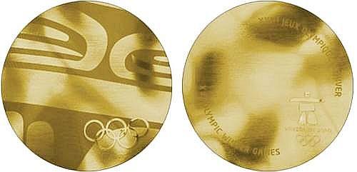 金牌的正面圖案來源于加拿大原住民設計師考琳?亨特創(chuàng)作的具有濃郁民族特色的抽象畫,每枚金牌只截取抽象畫的一小部分,沒有一枚獎牌的正面圖案是相同的,這使得每枚獎牌都是獨一無二的,在奧運史上首開先例,而這枚20.3盎司的金牌也堪稱奧運史上最貴的金牌,出自于加拿大皇家造幣廠。