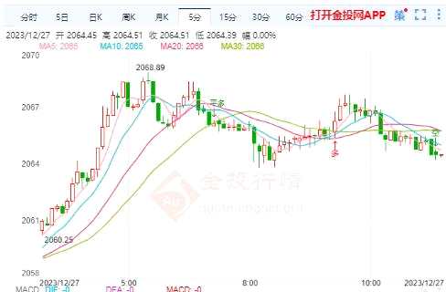 摘要周三(12月27日)本交易日現(xiàn)貨黃金日內(nèi)維持震蕩,今日開盤報(bào)2067.58美元/盎司,最高觸及2068.40美元/盎司,最低觸及2063.82美元/盎司,截止發(fā)稿金價(jià)報(bào)2064.49美元/盎司,跌幅0.15%。