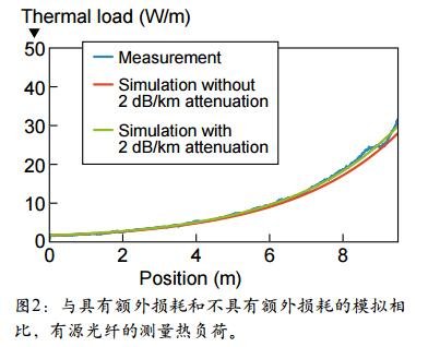 對于典型的有源光纖,圖 2 給出了從光纖放大器內部同時分布式溫度測量提取的測量熱負荷與模擬熱負荷的比較。為了準確地預測縱向溫度曲線,假定僅有 2dB/km 的額外損耗,這顯示了非常低的損耗。